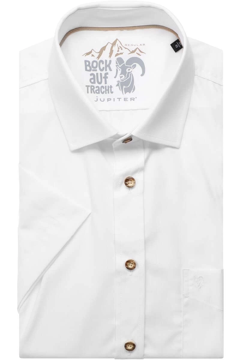 Dieses Jupiter Regular Fit Trachtenhemd in der Farbe weiss, Einfarbig hat den Armtyp Kurzarm. Das Hemd ist Pflegeleicht und aus hochwertigem Popeline Stoff aus 100% Baumwolle genäht.