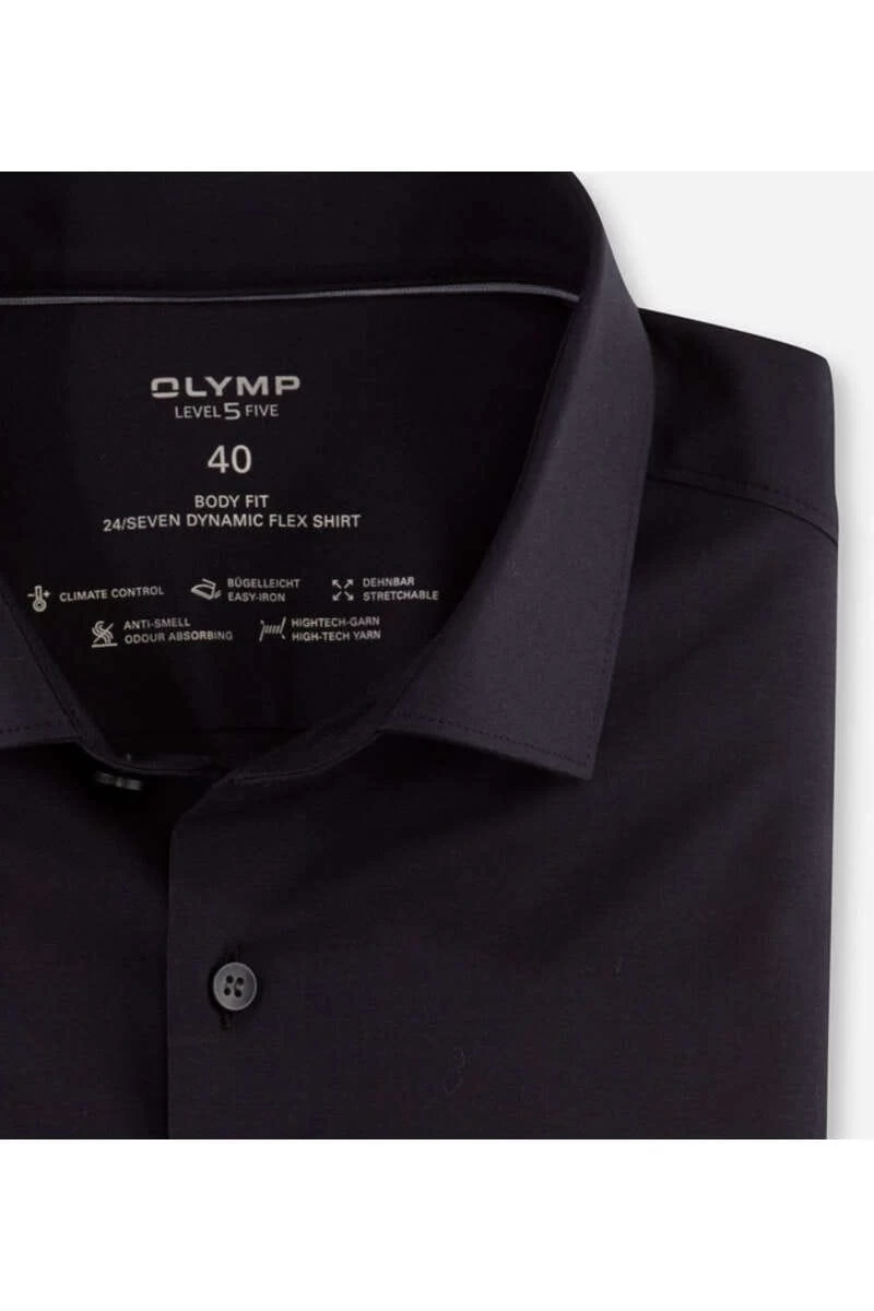 Das OLYMP Level Five Body Fit Hemd mit einem New Kentkragen, in der Farbe schwarz – Einfarbig. Das taillierte, körperbetonte Business-Hemd mit natürlichen Comfort Stretch für uneingeschränkt hohen Tragekomfort. Formbeständig und besonders bügelleicht.