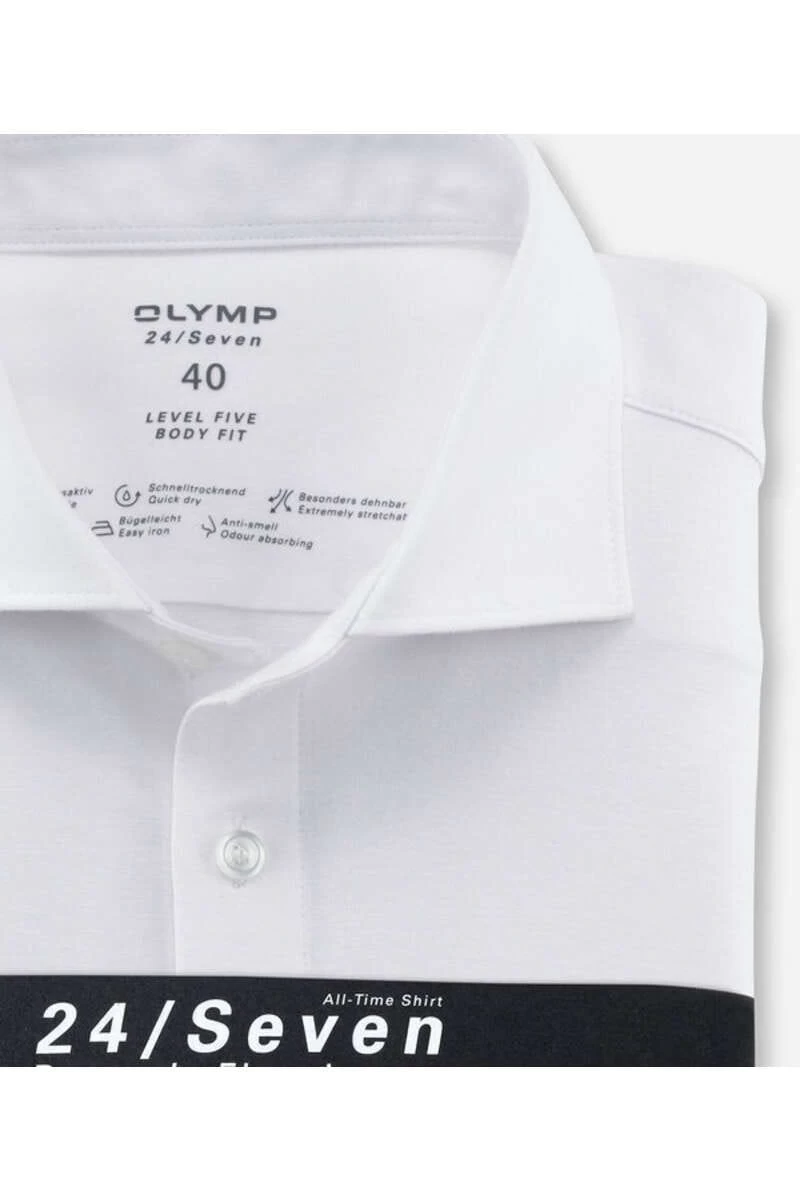 Das OLYMP Level Five Body Fit Hemd mit einem Kentkragen, in der Farbe weiss – Einfarbig. Das taillierte, körperbetonte Business-Hemd mit natürlichen Comfort Stretch für uneingeschränkt hohen Tragekomfort. Formbeständig und besonders bügelleicht.