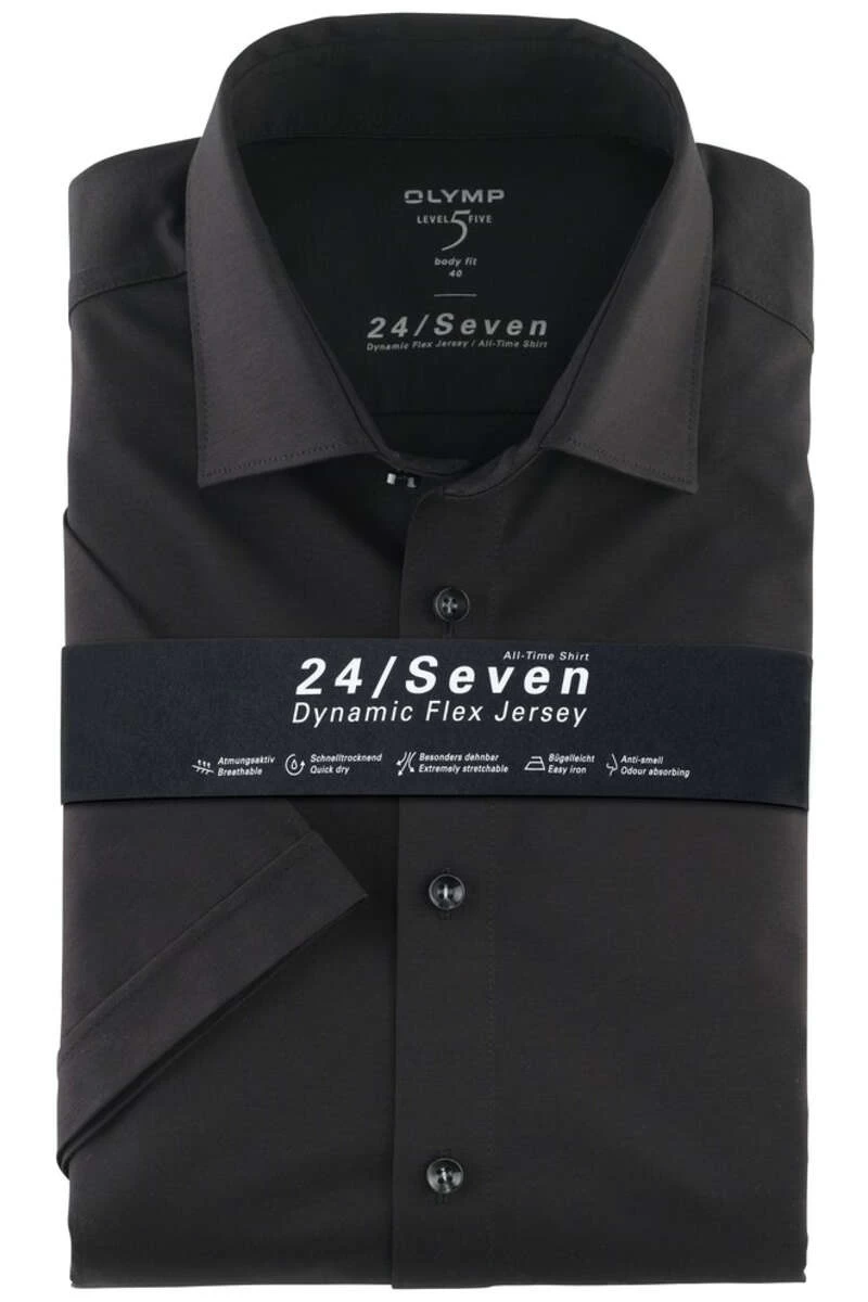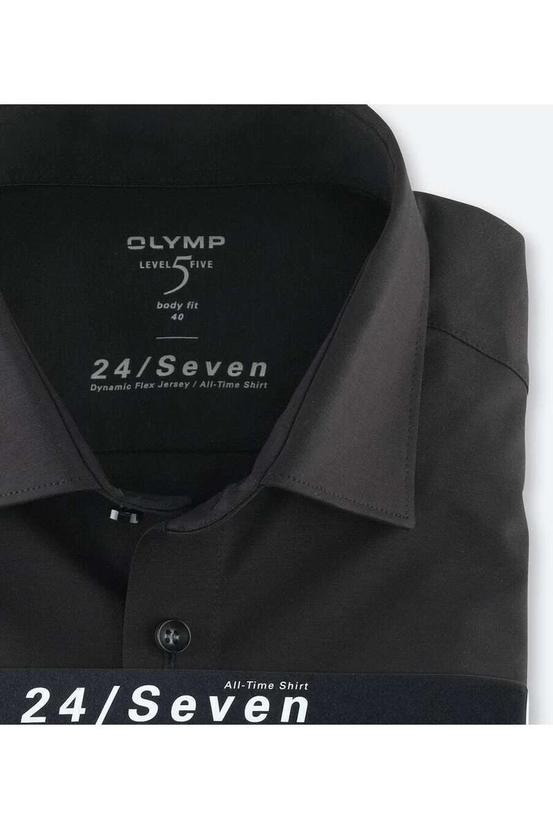 Das OLYMP Level Five Body Fit Hemd mit einem Kentkragen, in der Farbe schwarz – Einfarbig. Das taillierte, körperbetonte Business-Hemd mit natürlichen Comfort Stretch für uneingeschränkt hohen Tragekomfort. Formbeständig und besonders bügelleicht.