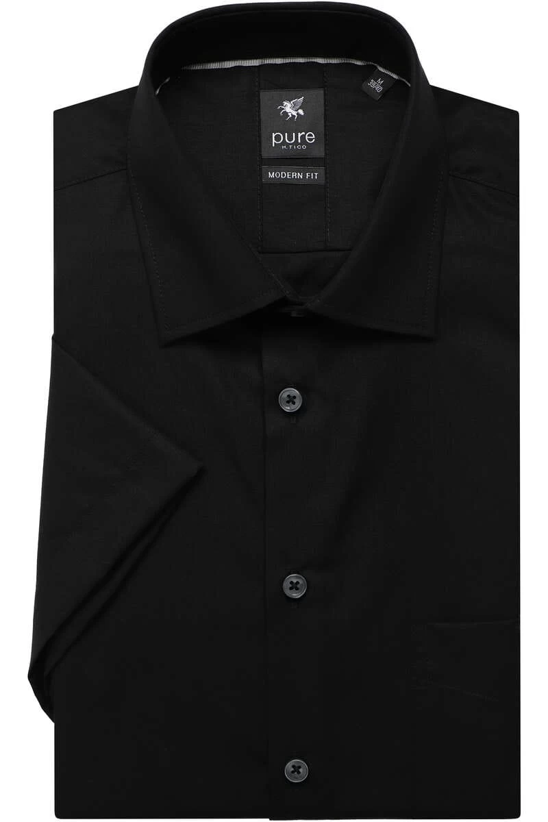 Dieses Pure Modern Fit Hemd hat die Farbe schwarz – Einfarbig und einen Kent-Kragen. Das Hemd ist aus Popeline-Stoff aus 100% Baumwolle und die Armlänge ist Kurzarm.